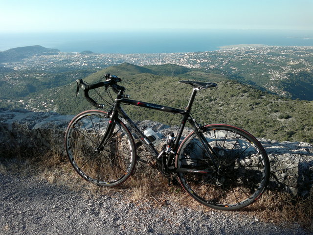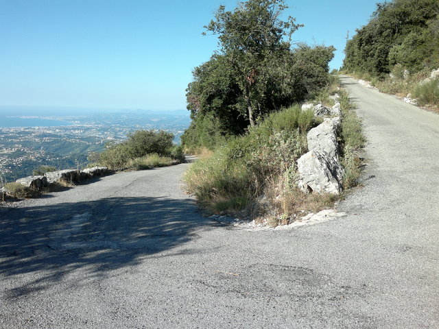 Buongiorno a tutti, sono assente da un pò in questo thread ma ho continuato a fare uscite in questo periodo. Quella che mi ha dato più soddisfazione personale è stata la scalata al Mont Chauve, sopra Nizza in Costa Azzurra. Un picco di 854m partendo dal mare, il tutto in 16km. E detta così non sarebbe nemmeno tragica, se non fosse che dopo 10 km ti trovi appena a 100m di quota e te ne mancano ancora 750 da fare in 6km. Con un falsopiano. In breve, negli ultimi 4 km si affronta una ex strada militare, l'asfalto è grezzo e con molta ghiaietta e i tornanti hanno pendenza tra il 18 e il 22%.
