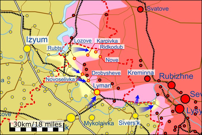 Lyman è uno dei punti in cui i russi hanno fermato la controffensiva ucraina delle scorse settimane (era essenziale per proteggere Severodonetsk quindi hanno concentrato lì le loro forze), nella zona ci sono combattimenti da molti giorni. Adesso sembra che il tentativo sia aggirarla un po' come hanno fatto con Izyum, ma anche Svatove potrebbe essere un obiettivo importante.
