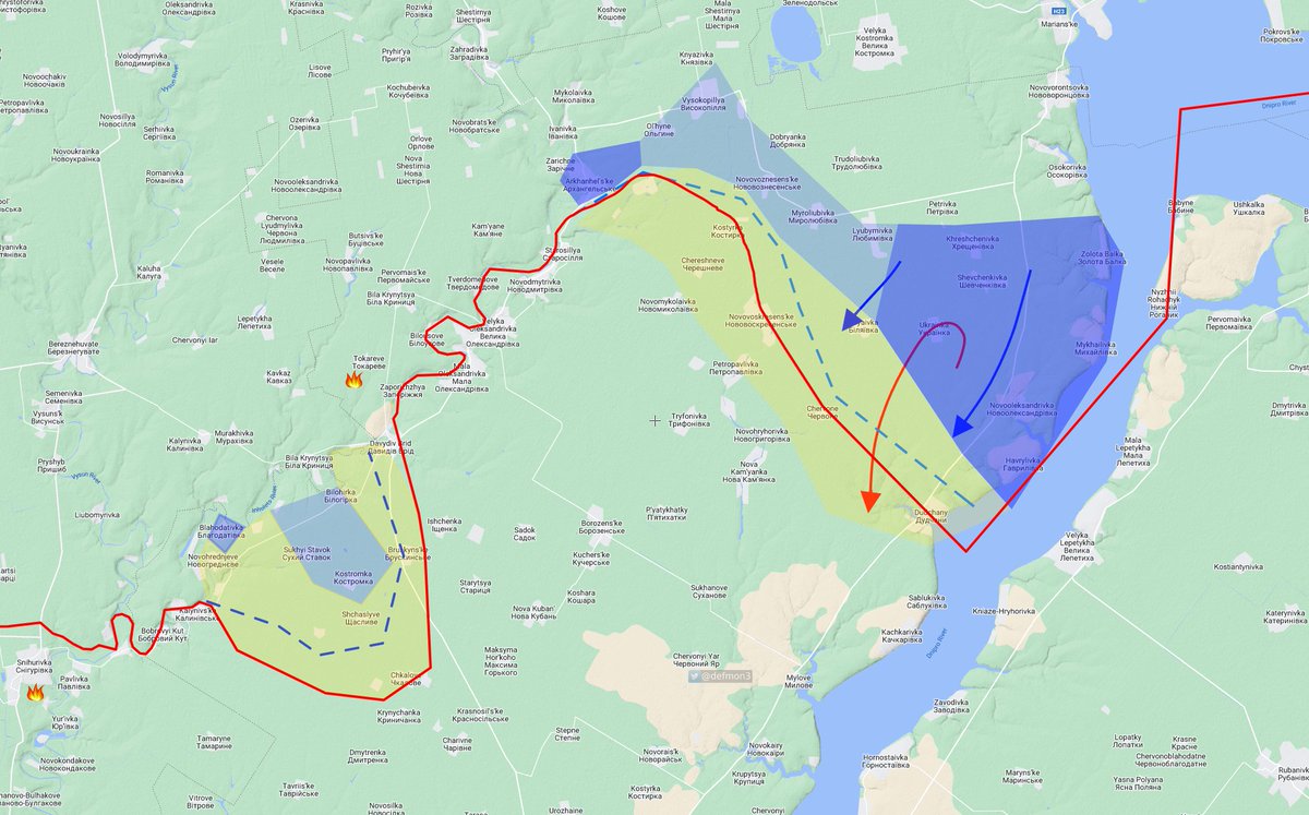 Sul fronte sud, confermata la rapida avanzata lungo il fiume Dnipro, i russi stanno cercando di organizzare la difesa vicino a Dudchany, dove hanno fatto saltare il ponte.