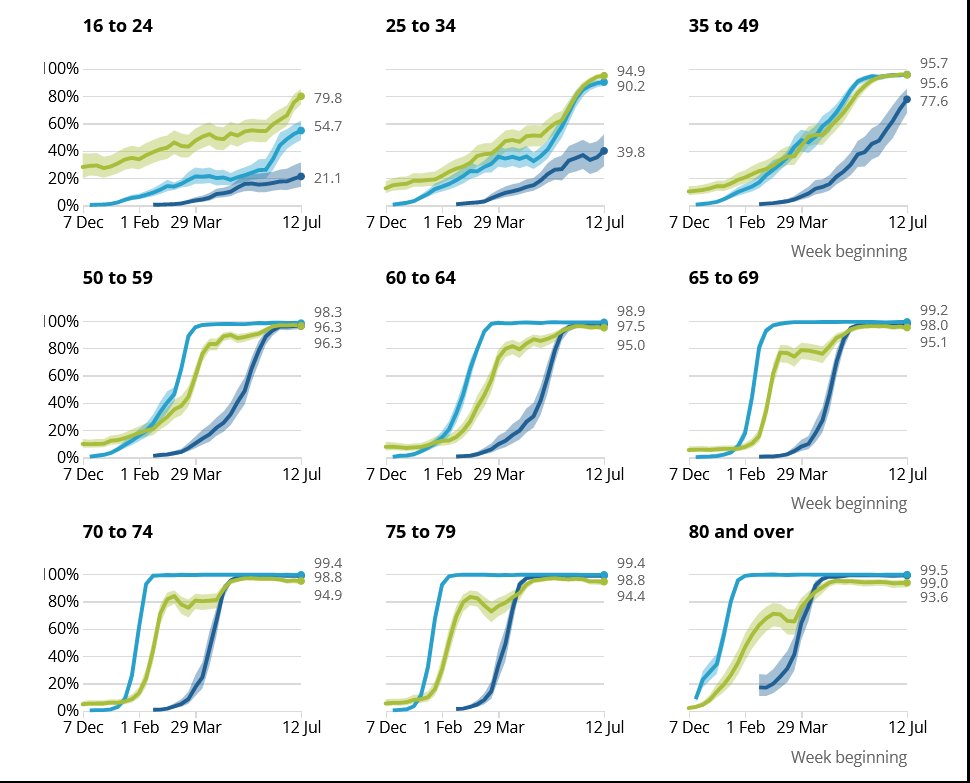 In inghilterra è probabile che sia anche quasi finita la benzina (con il limite che non sappiamo esattamente quanto questo possa prevenire nuove infezioni/sintomi) si stima che il 94% degli adulti ha gli anticorpi, anche nella fascia di età meno vaccinata 16-24(21% con due dosi e 55% con 1) si arrivava al 18 luglio all'80%, nelle altre categorie 94% ed oltre.