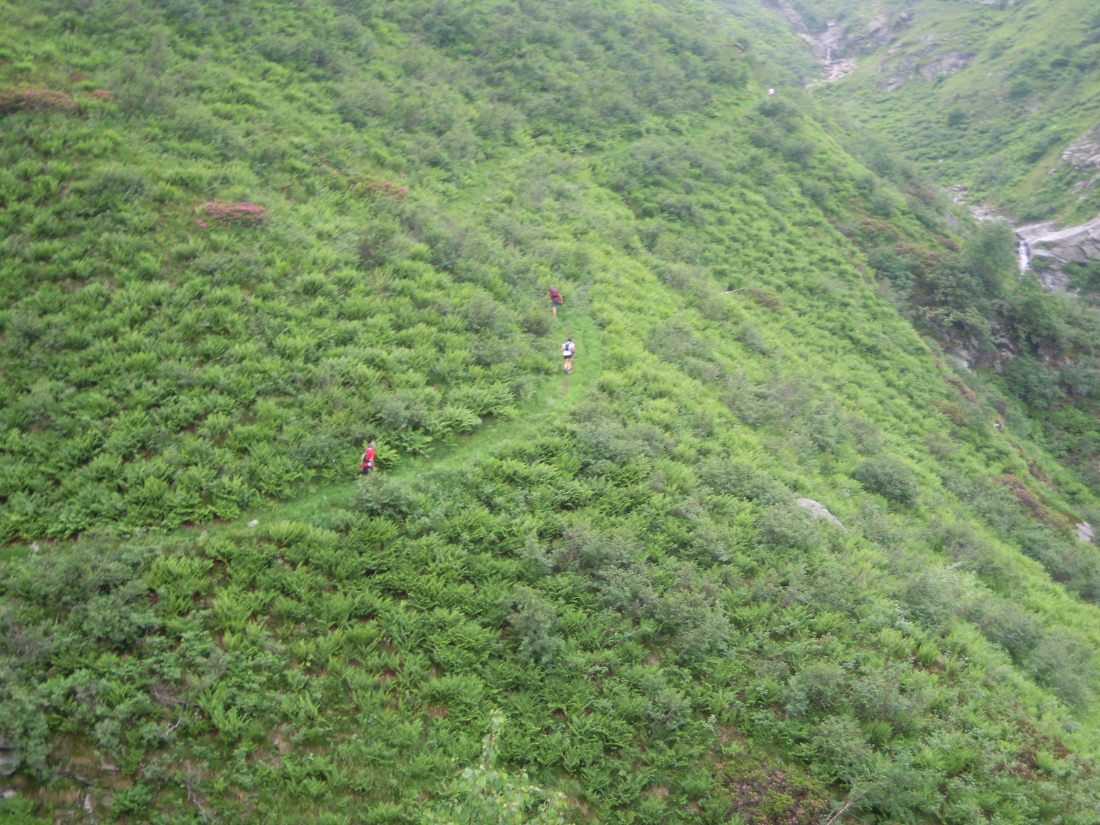 Partenza alle 8.30 come da programma e 30' di "riscaldamento"...infatti il primo pezzo di gara è un tratto di circa 6km di percorso ondulato, misto asfalto/sterrato, che si fa a ritmo soft per non disperdere energie inutilmente nel primo pezzo di gara che non ha nessuna importanza. Al 6°km si attraversa ilò torrente angrogna e inizia la gara vera, quando si affronta la 1° salita di poco meno di 500m di dislivello che ci porta al rif. Barfè...qui troviamo il 1° ristoro, nebbia e ahimè anche la pioggia...finchè è pioggia va bene, ma poco dopo sono arrivati anche i tuoni e allora la cosa si fa meno piacevole. Il ritmo è buono, i bastoncini aiutano, sia sulla leggera salita utilizzati come i bastoncini da sci di fondo, sia sul ripido sui quali ci si appende letteralmente. Dopo vari attraversamenti dei canaloni che scendono dal M.Vandalino arriviamo al rif. Sap...ristoro e si partenza. Qui mi accorgo di avere le gambe molli e un po indolenzite...ahia, brutto segno. Discesa su sentiero approssimativo e molto sconnesso, doloroso per le gambe affaticate e si riattraversa il torrente Angrogna ma a quota 1200m. Da qui ci aspetta un muro di 15' di percorrenza che metterà a dura prova le gambe...infatti mi sono ritrovato inchiodato, su sto sentiero viscido e scivoloso, attaccata ai bastoncini che come non mai mi sono stati di aiuto. Superata questa salita c'è da fare un traverso anche questo rognoso e sconnesso, che ci porterà ad affrontare la salita più lunga e dura che ci porterà al colletto a quota 1800m...nel frattempo però, alcuni addetti del controllo mi comunicano di una variazione del percorso per pericolo di temporali, quindi niente più cresta e passaggio su una strada sterrata 200m sotto...da un certo punto di vista è un peccato snaturare una gara, ma la decisione mi è parsa saggia...saggia anche per le mie gambe che stavano dando i primi cenni di crampi ai quadricipiti...usando i bastoncini i polpacci, che sono i primi a patire, sono stati risparmiati, mentre i quadricipiti hanno patito le discese rognose...