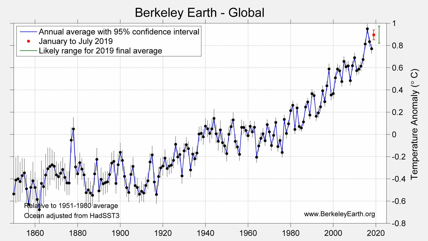 L'anomalia media mensile della temperatura a livello globale registrata nel mese di luglio 2019, ossia la media della temperatura dell'aria sulla superficie terrestre e delle SST è stata di + 0,43 ° C rispetto alla media del periodo 1981-2010, + 0,77 ° C rispetto alla media del 20 ° secolo risultando il mese di luglio più caldo dal 1891 insieme al mese di luglio 2016.Su una scala temporale più lunga, le temperature medie superficiali globali sono aumentate ad un tasso di circa +0,70 ° Cper secolo.