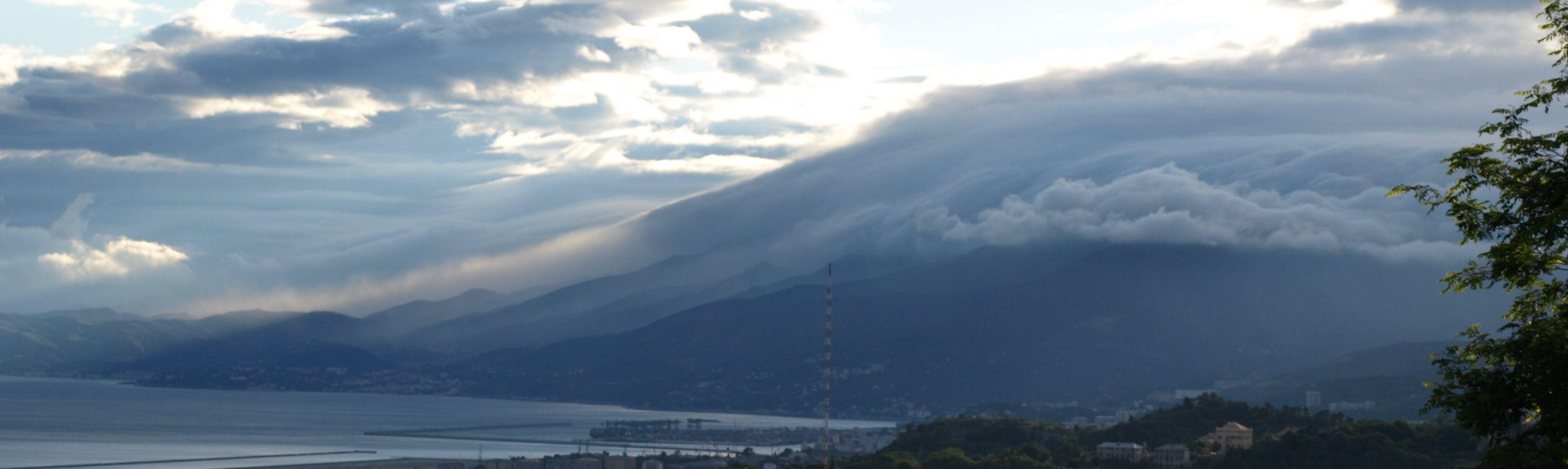 ... cielo non propriamente estivo questa sera sopra Genova. Mentre il centro della LP si sposta dal golfo ligure verso SE, le correnti da NE sulla pianura padano ammassano nuvole e pioggerella sul versante nord degli Appennini. Sul crinale il caigo, ovvero nuvole stirate dal vento, formano una coperta bianca e subito inizia la discesa sul crinale SUD verso il mare. Il vento sostenuto trascina la nuvola verso il basso. Man mano che scende di quota dai 1.200 metri del Beigua la temperatura sale e l'umidità sotto forma di nuvola cerca di trasformarsi nuovamente in vapore trasparente, ma non ci riesce del tutto lasciando intendere che il differenziale di temperatura tra le vetta e la costa non è così grande.