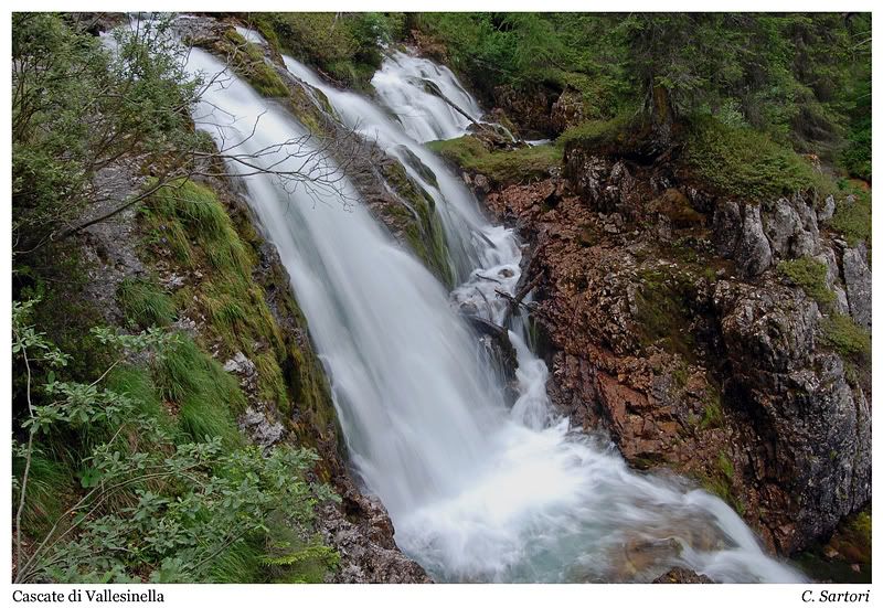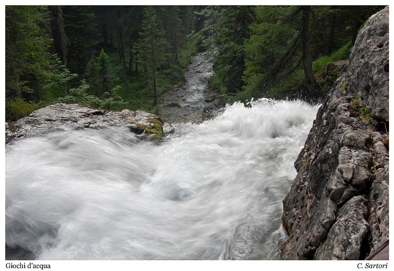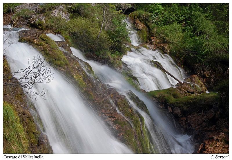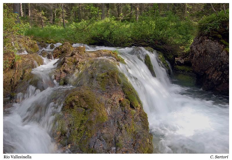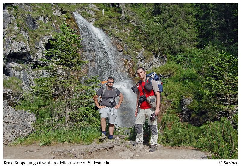 Weekend che ho voluto fortemente questo appena passato. Un weekend nel cuore delle Dolomiti di Brenta, la montagna che più amo, la montagna che conosco più di ogni altra cosa, la montagna che per me è una seconda casa. Sabato pomeriggio partenza da casa con bru e kappe (qui si va di soprannomi … :D) e via verso Madonna di Campiglio, purtroppo passando per Pinzolo, sede del ritiro della Juve…. Frust! Verso le 15.30 prepariamo zaini e materiale vario per la ferrata del giorno dopo e ci incamminiamo lungo il sentiero delle cascate di Vallesinella. Le cascate sono cariche di acqua, grazie alle piogge e soprattutto alle neve ancora presente in molte zone del Brenta. Giochi d’acqua e luci semplicemente fantastici, ce la prendiamo con estrema calma, il sole fa spesso capolino dalle nubi e con i riflessi dell’acqua e la natura rigogliosa crea un’atmosfera unica. Superiamo le cascate e ci troviamo nella conca meravigliosa di Malga Vallesinella Alta in mezzo a mille fiori di mille colori. Ci fermiamo brevemente a bere qualcosa, superiamo la Malga e seguiamo il comodo sentiero che con pendenza dolce raggiunge il Rif. Casinei. Passo da quel punto in cui con Rita e Flavio ci siamo dovuti fermare 3 mesi prima (……….) Il paesaggio e la natura sono completamenti diversi. Amara scoperta… da quel punto al Rif. Casinei solo 8 minuti. Bah!