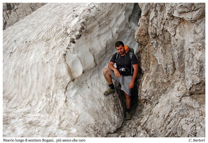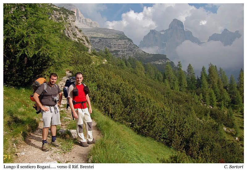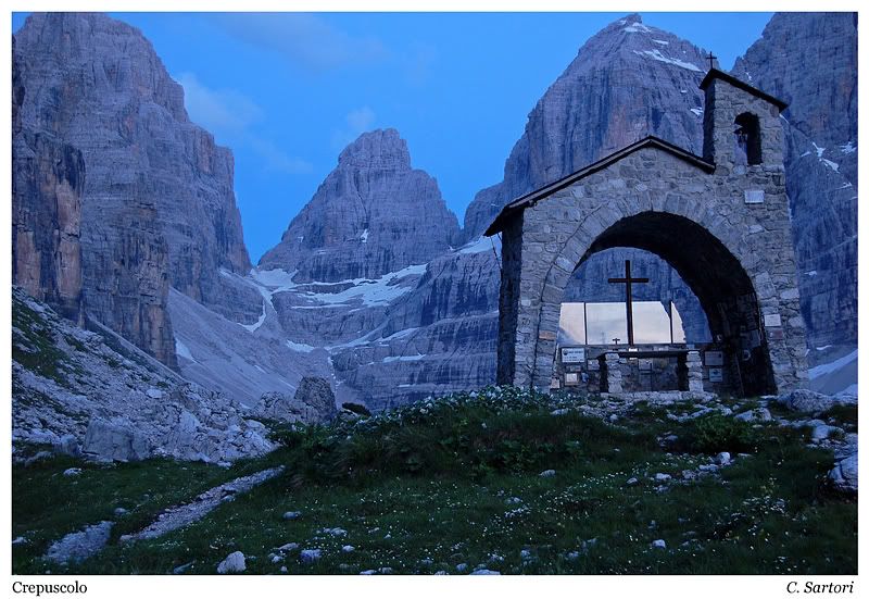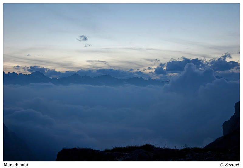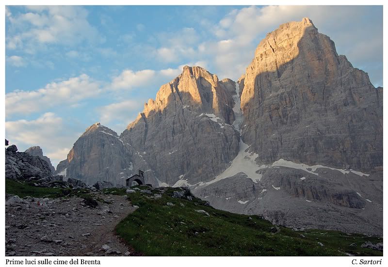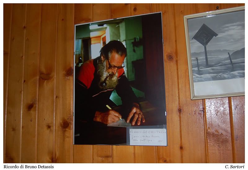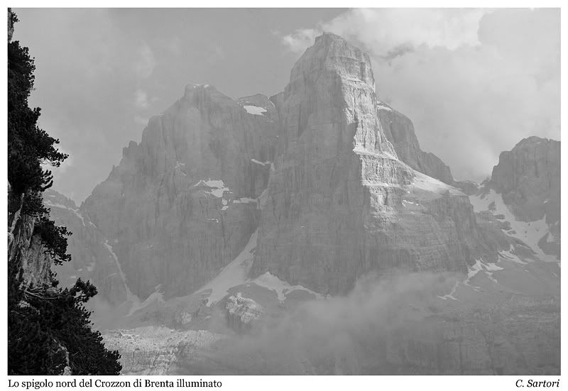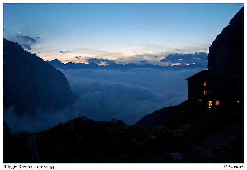 Al Casinei prendiamo il sentiero per il Rif. Brentei, la salita è un po’ più dura e comincia a calare la nebbia, amata e odiata, amata perché ci risparmia dalla cotta del sole, odiata perché ci toglie un panorama unico al mondo. Piano piano la vegetazione scompare, i larici lasciano spazio ai mughi e ai rododendri, quindi agli sfasciumi. Manca poco al Rifugio quando d’un tratto si apre una schiarita, la nebbia scompare. Immaginate si essere in un’atmosfera ovattata e grigiastra e d’un tratto vi trovate di fronte le guglie del Brenta…. Cima Tosa, Crozzon, Torre di Brenta, Sfulmini, Campanil Alto, Campnil Basso, Bocca di Brenta, Bocca dei Camosci…. Da autentica commozione! E sorpresa delle sorprese a poche centinaia di metri dal Rifugio, lungo il sentiero, un nevaio! MAI visto da quando salgo da queste parti (in pratica ogni anno almeno una volta)… ovvia esaltazione. Al Rifugio arriviamo verso le 19.30 e siamo accolti dal profumo che viene dalle cucine; in poco tempo mettiamo le nostre cose nella stanza e siamo seduti a tavola. Come sempre l’accoglienza e il calore dei gestori del Brentei è speciale. All’interno del Rifugio molte foto del Bruno.. questa era la sua casa. Finiamo di mangiare, guardo fuori dalla finestra.. Visibilità pressoché nulla, nebbione. Come un’ora prima in pochi istanti la nebbia lascia spazio a qualcosa che rimarrà indelebile nella mente. Mare di nubi e vette di Adamello e Presanella che svettano come isole all’orizzonte. Corro a prendere la macchina fotografica e mi dirigo verso la cappella del Rifugio poco distante. Contemplazione e foto. Poi è l’ora di andare a dormire.. sono le 22.