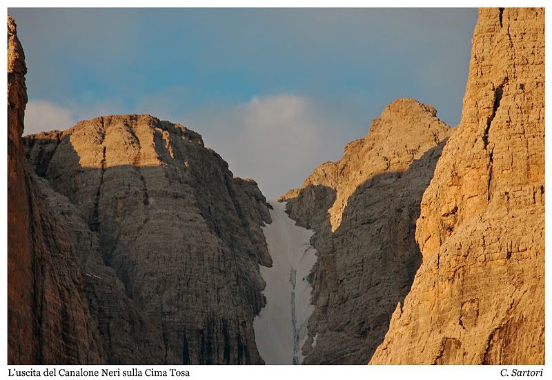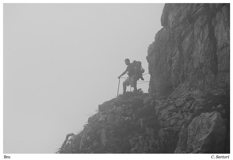 Sveglia verso le 5.30 il giorno dopo, sguardo immediato al tempo, ancora un po’ di nebbie ma il cielo è pressoché sereno, nessun mare di nubi come la sera precedente. Usciamo a scattare un po’ di foto, le cime del Brenta sono illuminate dal primo sole e prendono il colore infuocato classico delle Dolomiti. Facciamo colazione, mettiamo imbrago e set da ferrata e ci incamminiamo verso l’attacco del sentiero Sosat che dista una mezz’oretta dal rifugio. Lasciamo il sentiero che porta al Rif. Alimonta e svoltiamo a sinistra e raggiungiamo la cengia dove inizia il sentiero attrezzato vero e proprio. Nel frattempo il cielo è diventato pressoché sereno, non c’è una nuvola e le foto che scattiamo sono tantissime.. oltre 200 solo le mie alla fine della giornata. Ora non sto qui a descrivere il percorso nei dettagli, qui è descritto magnificamente http://www.vieferrate.it/ferratasosat.htm . Usciamo dalla ferrata che il tempo sta peggiorando, parecchi cumuli stanno crescendo a ovest, incontriamo un folto gruppo che inizia ora il sentiero (BAH!). Comincia a piovere molto debolmente e a tratti, ma il rifugio Tuckett è li a pochi minuti. La bocca del Tuckett è ancora bella carica di neve con mia grande gioia. Al Rifugio pranziamo lasciamo che si sfoghi un temporale che si è formato in zona. Ripartiamo e dopo chi minuti comincia a piovere, qualche chicco di grandine. Smette ben presto ma il radar che ho consulto sul telefonino è minaccioso.. temporale in avvicinamento dal lago d’iseo. Aumentiamo il passo e superiamo molti gruppi di persone. Superiamo senza fermarci il Casinei. Dal Tuckett a Vallesinella 50 minuti… tabella SAT 1h45m… Tempo di arrivare al Rif. Vallesinella che viene giù il mondo, poche fulminazioni ma secchi di acqua. Nonostante l’ultimo pezzo di corsa weekend meraviglioso nel cuore del Brenta.