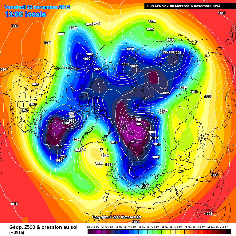 A questo punto dicevamo, senza CW, con un aleutinico prepotente ritornato nella sua collocazione naturale, sebbene ancora non intrusivo, può nascere l'ondulazione, è sufficiente anche un regime di AO+, utile per le saccature Artiche senza split, eccola, puntuale, per la terza decade di Novembre, è una carta molto lontana, ma secondo me ne possiamo riparlare tra qualche giorno