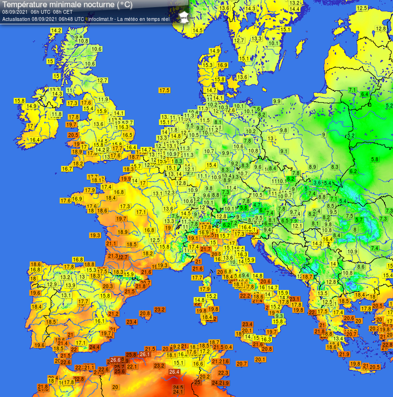 Molto calda, anche se dietro di qualche decimo sotto i 23°, Vouillé in Aquitania (Francia). Degna di menzione anche Aberporth, sulla costa del Galles, che strappa sotto ventilazione favonica ben 20,5° che è abnorme come minima per Settembre in UK, tra l'altro è una minima pienamente tropicale!