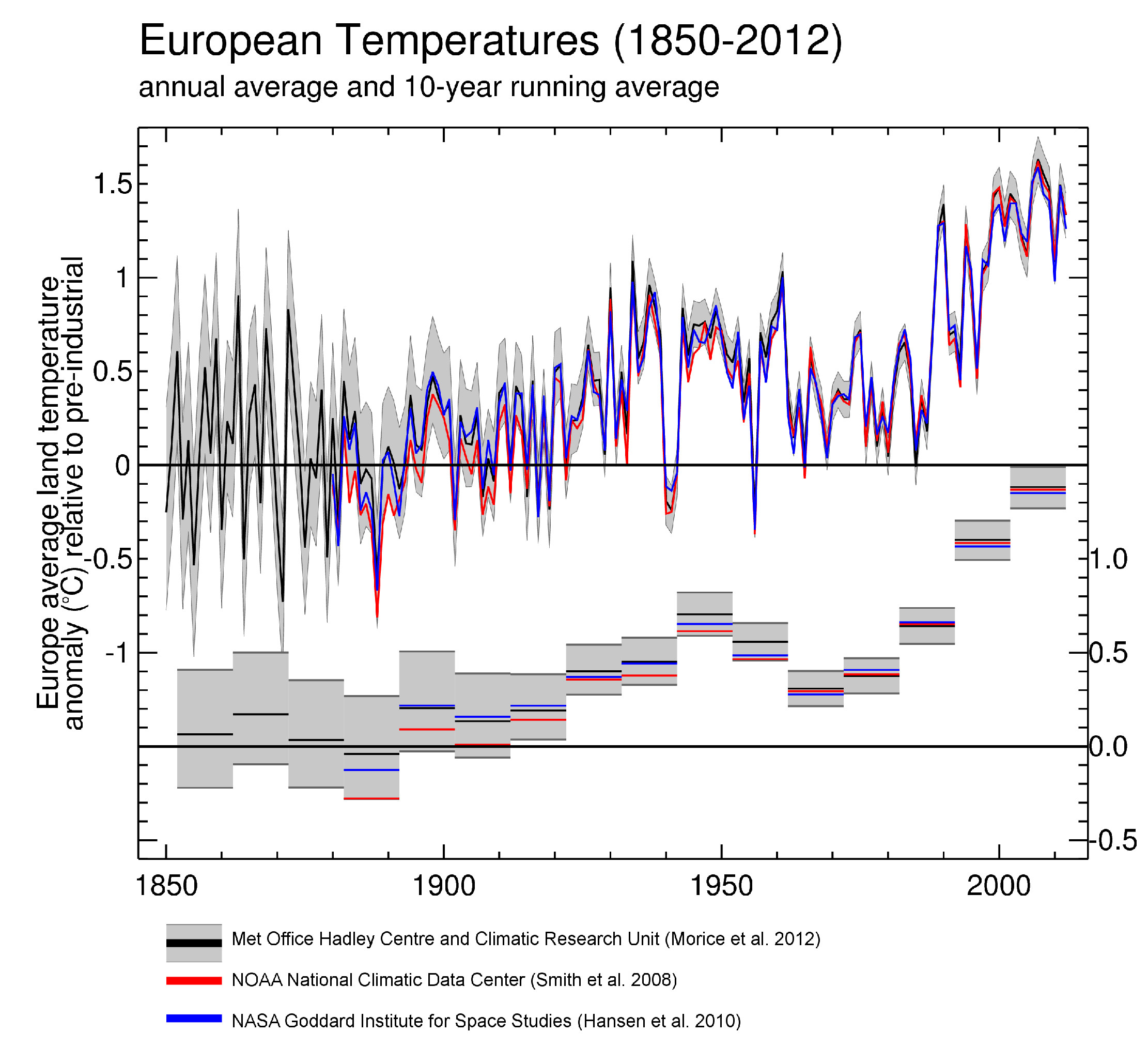 il trend di fondo è, volente o nolente, quello a prescindere dall'alta frequenza dei cicli NAO. che poi un decennio di NAO- sia più fresco di un decennio di NAO+ non ci piove (più o meno...) ma la sostanza quella è: la NAO può pure fare i cicli che più gli aggrada, le T aumentano comunque.