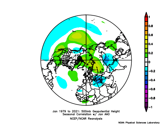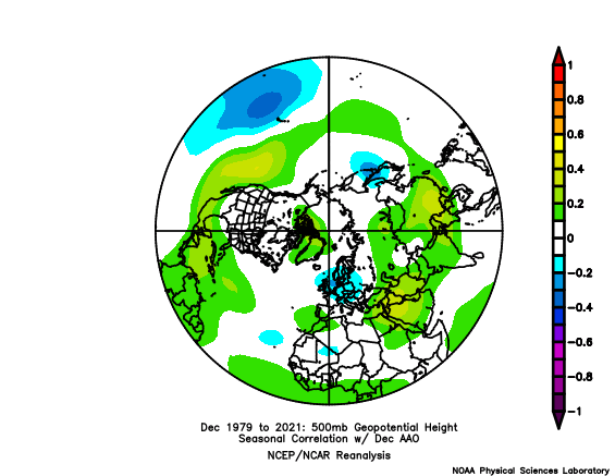 Ma perché abbiamo una "ciambella anticiclonica" sulla Groenlandia? Per una questione di correlazione tra AAO e valori di GPT sul NH a dicembre: