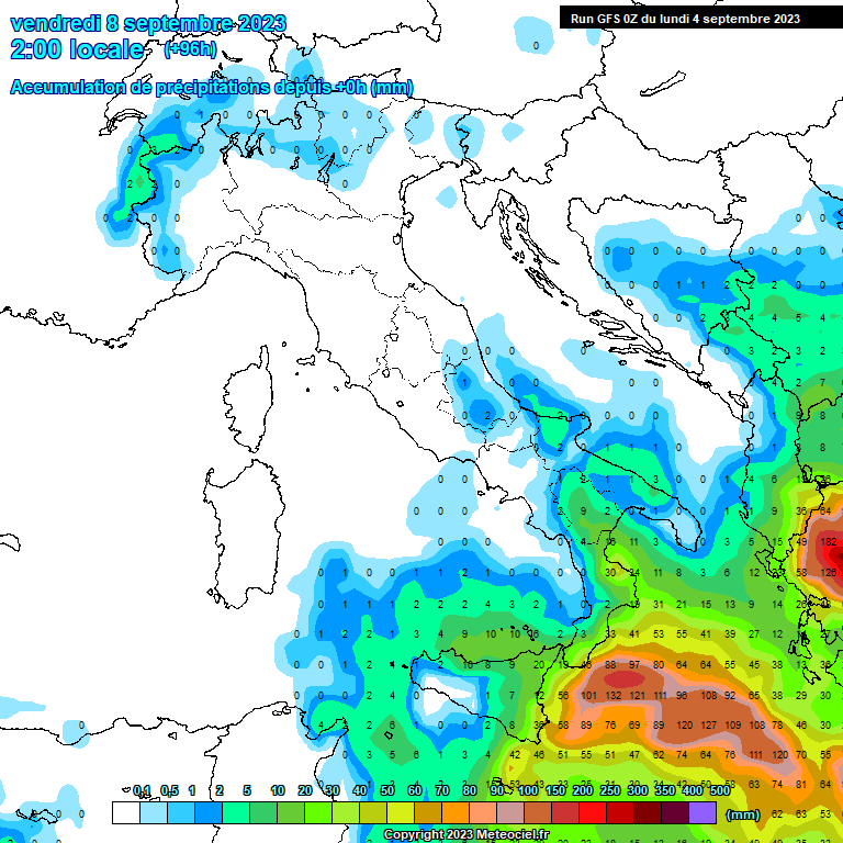 Accumuli previsti entro le 96 ore, il grosso è previsto in mare ma non è da escludere qualche precipitazione importante anche sulla terraferma, in pole le zone ioniche di Calabria e Sicilia.