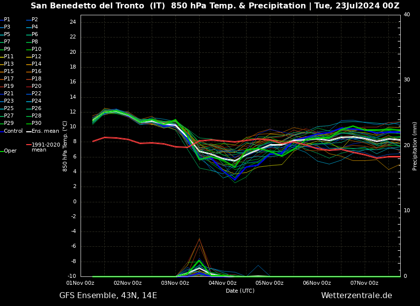 In merito alla mia località centro adriatica confido nella media degli spaghi ad inizio agosto. L'ufficiale a quella distanza sta variando molto nelle corse per cui cerco di non dargli troppo peso. Ancora non sono completi gli spaghi dell'inglese/bolognese. Spero seguano la stessa tendenza di GFS.
