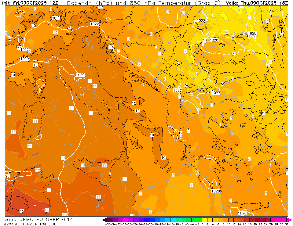 UKMO 12 mostra, per il week end, un treno di aria gelida di estrazione artico-continentale in discesa verso i Balcani che addirittura risulterebbe più fredda di quanto osservato in altri modelli. Il campo barico previsto piuttosto alto non permetterebbe però di avere precipitazioni se non qualche fiocco sparuto per effetto stau sotto le catene montuose esposte. Bello il "treno" ma l'asse di inclinazione non è quello desiderato.