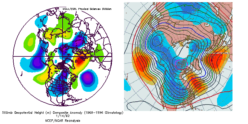 Una situazione incredibilmente simile anche a livello troposferico, dove era presente un 3 wave pattern disposto similmente a quanto previsto dalla media ENS a 216h. Qualche differenza tra Pacifico e W-USA, probabilmente dovuto al fatto che allora c'era un forte Nino, mentre quest'anno una forte Nina.