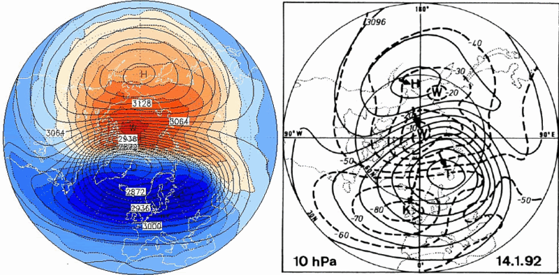 I centri di bassa (T) e alta (H) altezza geopotenziale, nonchè il core caldo (W) e freddo (K), sono previsti alla quota di 10hpa a 192h (figura a sinistra) praticamente nelle stesse identiche posizioni rispetto a quelli del 14/01/1992 (figura a destra):