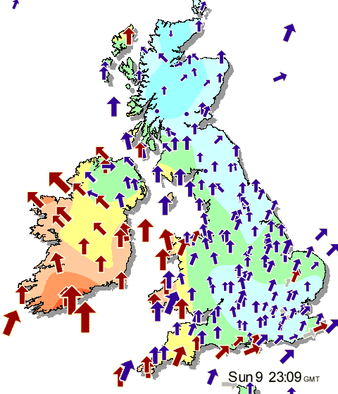 Al momento le raffiche più forti (58 nodi) si registrano presso la Marathon Gas Platform, di fronte alla baia di Roches Point:Codice:LATEST IRISH WEATHER REPORTS ON 9-MAR-2008 for 22:00 Location Wind Weather Temp Humidity Rain Pressure Dir Speed(Kts) °C (%) (mm) (hPa) BELMULLET SE 28 Gust 48 LIGHT RAIN 5 97 1.9 961 BIRR(P) S 20 Gust 36 - n/a - 5 87 0.3 972 CASEMENT S 23 Gust 40 LIGHT RAIN 6 65 Trace 977 CLAREMORRIS(A) SE 18 Gust 31 - n/a - 4 91 2.0 967 CLONES(P) SE 21 Gust 33 - n/a - 5 69 0.0 974 CORK AIRPORT S 25 Gust 46 MODERATE RAIN 5 98 4.6 972 DUBLIN AIRPORT S 15 Gust 25 CLOUDY 6 71 0.0 977 FINNER CAMP(A) SE 19 Gust 39 - n/a - 5 77 n/a 970 JOHNSTOWN C (A) S 20 Gust 35 - n/a - 6 90 0.3 979 KILKENNY(P) S 20 Gust 32 - n/a - 6 89 0.4 976 KNOCK AIRPORT SE 25 Gust 42 LIGHT RAIN 2 96 1.7 967 MALIN HEAD SE 20 Gust 31 CLOUDY 4 74 0.0 973 MULLINGAR(P) SE 19 Gust 31 - n/a - 5 77 0.0 974 ROCHES POINT(A) S 44 Gust 57 - n/a - 7 100 2.9 972 ROSSLARE S 22 Gust 46 LIGHT RAIN 7 91 Trace 980 SHANNON AIRPORT SE 35 Gust 48 LIGHT RAIN 6 91 1.7 968 VALENTIA S 24 Gust 51 HEAVY RAIN 8