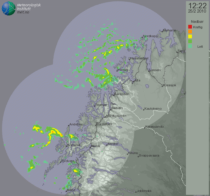 Dal radar si vedono bene i due ricciolini ben localizzati anche da GFS, ma Tromsų č al centro con un pugno di mosche (cosa gią successa st'inverno...)