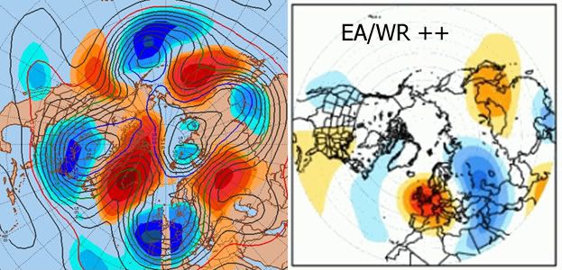 Dal punto di vista teleconnettivo, ci troviamo di fronte ad un pattern EA/WR negativo. Ecco il confronto tra la previsione ECMWF00z e la mappa di correlazione col pattern EA/WR positivo in Gennaio: