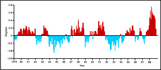 The mechanism that amplifies the solar signal is probably a phenomenon like El Niño/Southern Oscillation (ENSO), that is, thermal anomalies of the east equatorial Pacific waters: El Niño, warming, and La Niña, cooling. ENSO anomalies occur as irregular 2- to 7-year cycles, asso-ciated with large-scale changes of atmospheric pressure in the tropics, between the southeas-tern and western Pacific. ENSO influences the climate of the whole planet.52 Satellite measure-ments suggest that during the observation period of the last 20 years, El Niño of 1998 caused the strongest thermal anomaly in the Earth’s atmosphere. In April and May 1998, the deviation of the global temperature from the 1982-199l average reached +0.7°C.