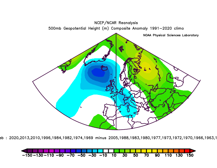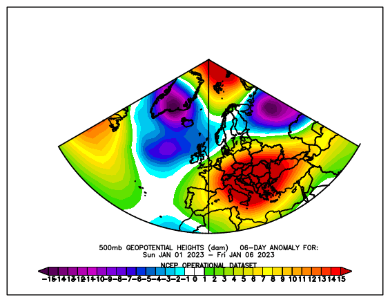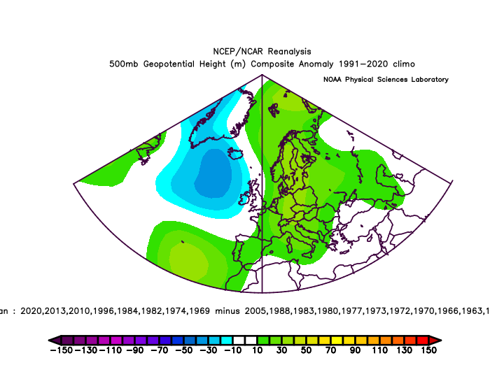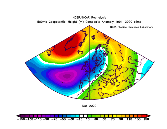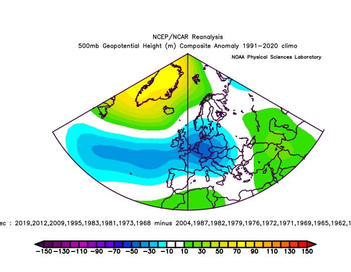 Tale predictor (il WP di giugno) si presta ad essere abbastanza anticorrelato all'EA invernale e se consideriamo che a giugno l'indice ha chiuso con un valore di -1,66 si spiega abbastanza facilmente il perché finora l'inverno su gran parte del Paese sia del tutto mancato. C'è da dire inoltre che se utilizzato in modo appropriato a grandi linee da delle discrete indicazioni anche sui singoli mesi; giusto per fare un esempio utilizzando gli anni che come questo a giugno hanno presentato un valore simile (oppure entro la mezza deviazione standard) si otterrebbe per dicembre questa ipotetica proiezione: