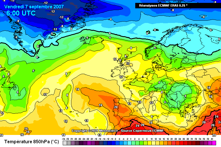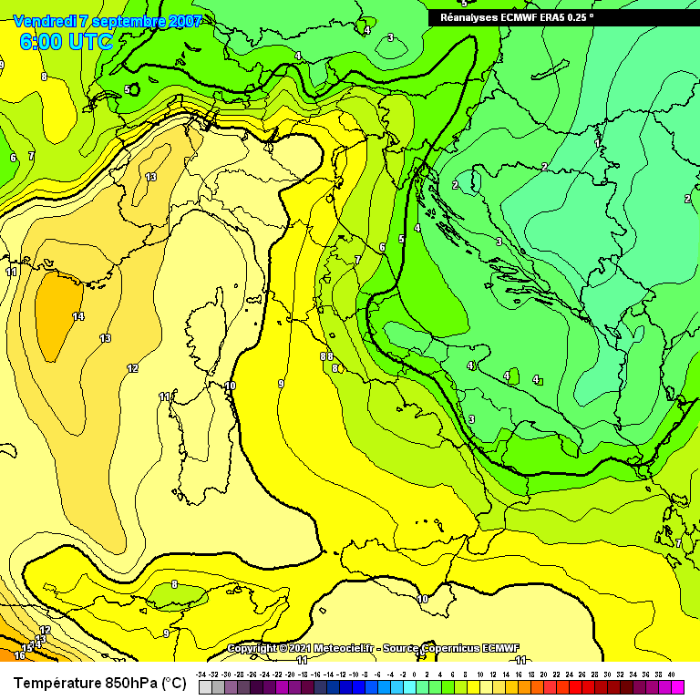 I radiosondaggi riportano i dati delle 00Z e delle 12Z, ma alle 6Z, vale a dire all'incirca alle 8 e cioè al momento esatto del temporale che mi svegliò, le reanalisi riportano queste temperature a 850 hPa,