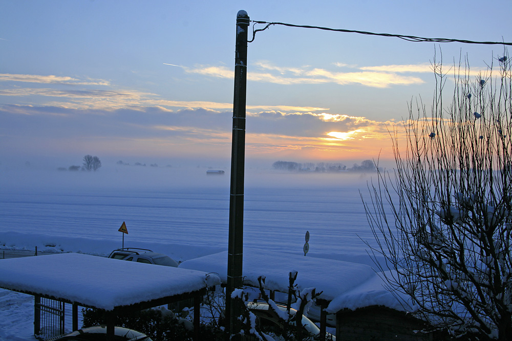Dopo i 26 cm di neve di venerdì ed i 14,5 cm di neve di sabato, questa mattina, alle 6.00 circa, i lcielo si è aperto ed ha consentito alla temperatura di scendere a -3,0°c. Paesaggio MAGNIFICO tra nebbia bassa e ghiaccio e neve illuminati e rosati dal sole.
