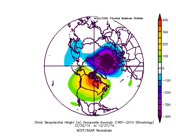 Luca, stavo guardando per caso la situazione strato nella terza decade di dicembre (reanalisys a 30 hpa) e mi sono imbattuto in questa situazione: